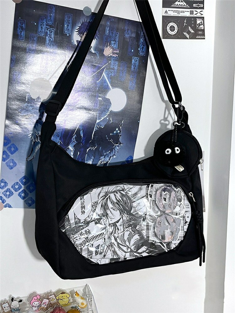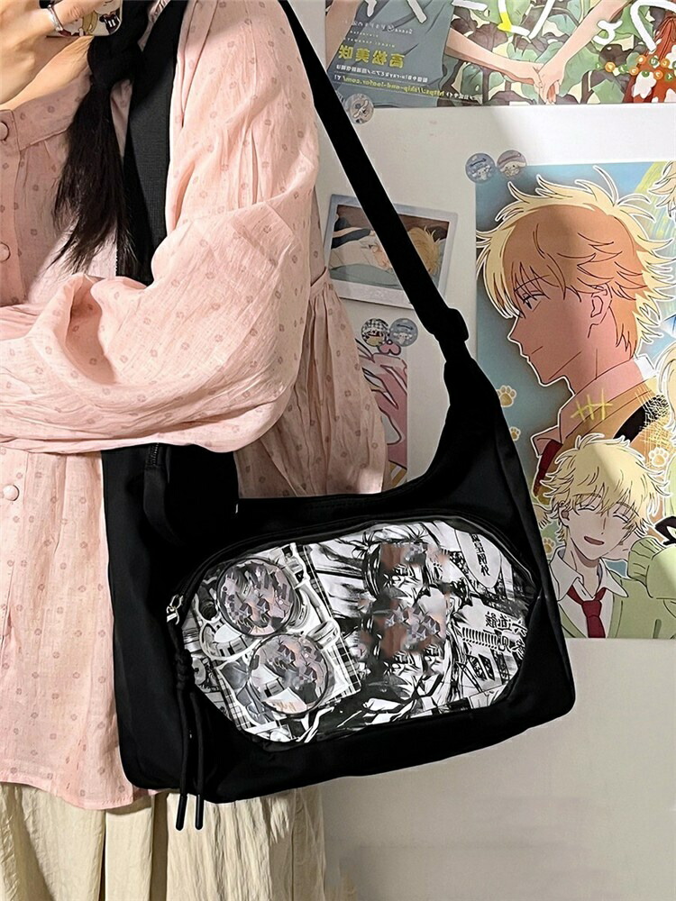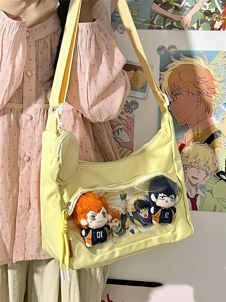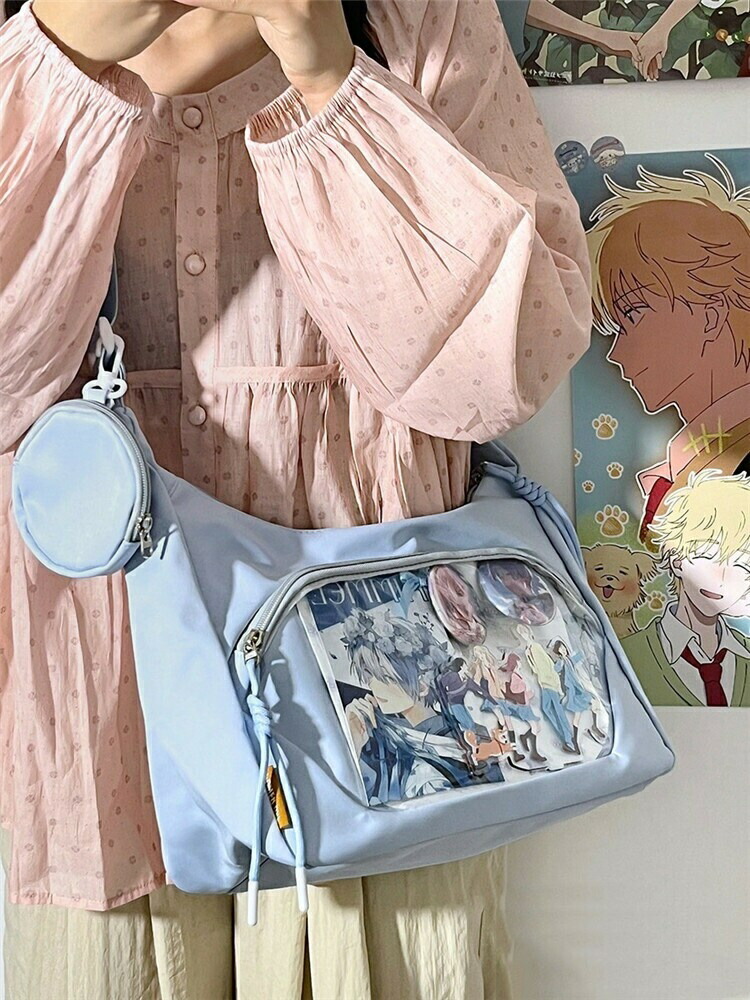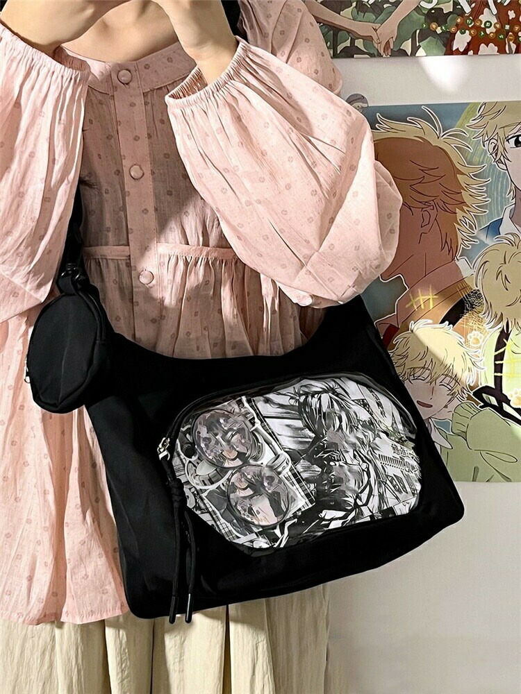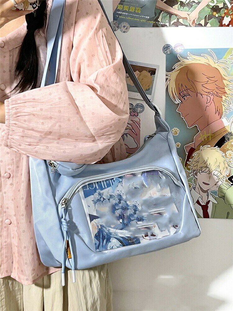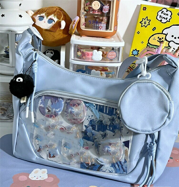 透明窓付きで「推し」がしっかり見せられる、ショルダータイプの痛バッグです。ぬいぐるみ・缶バッチ・キーホルダー・アクスタなど、お気に入りを自由にデコレーションできるデコバッグで、イベントやオタ活にもぴったり。