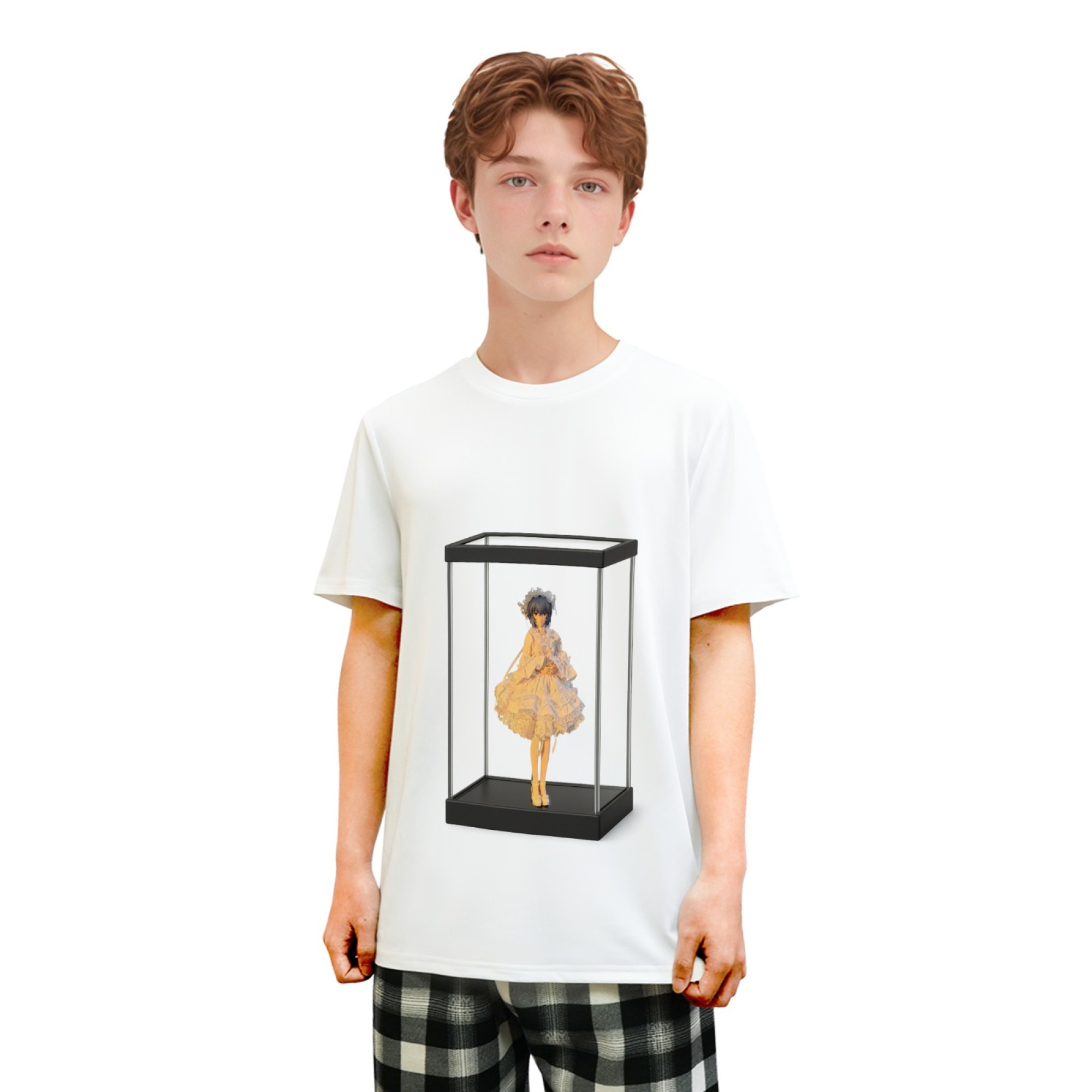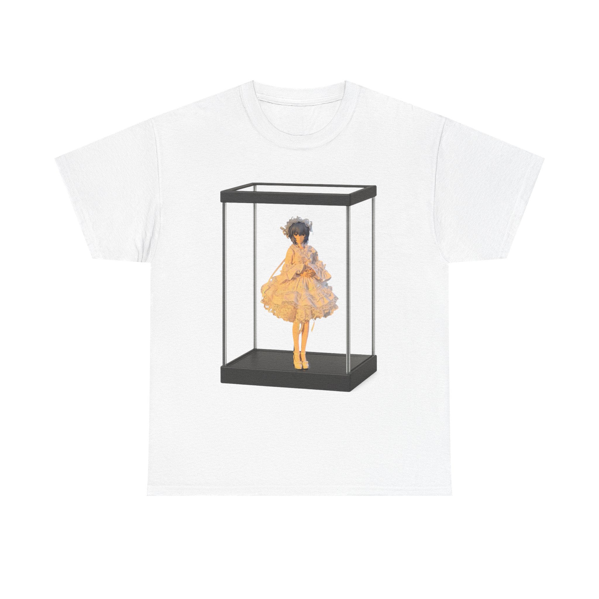 透明ディスプレイケースをプリントしたTシャツで、好きなフィギュア画像を自由に差し替えて、自分だけのデザインを楽しめます。