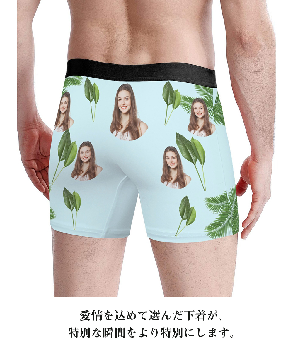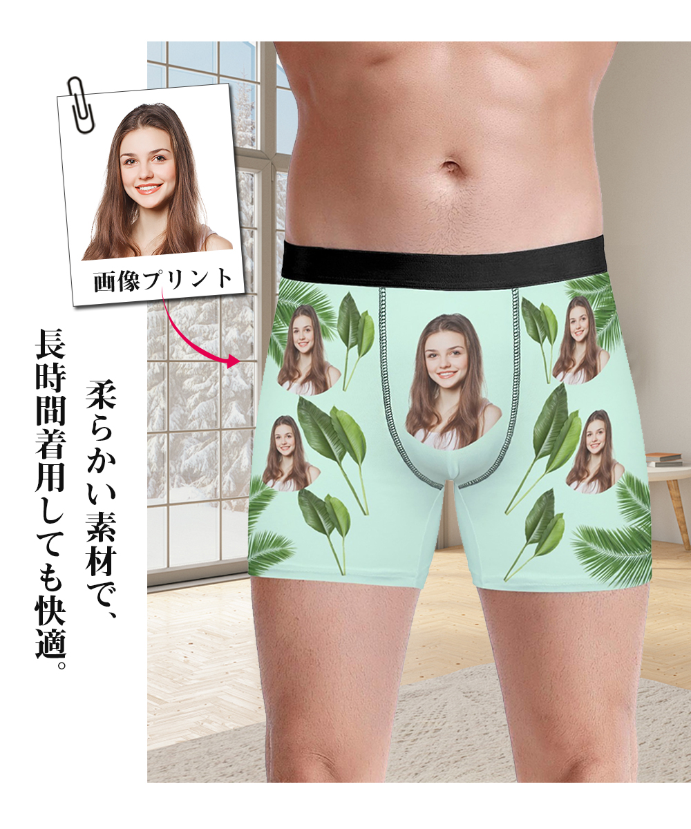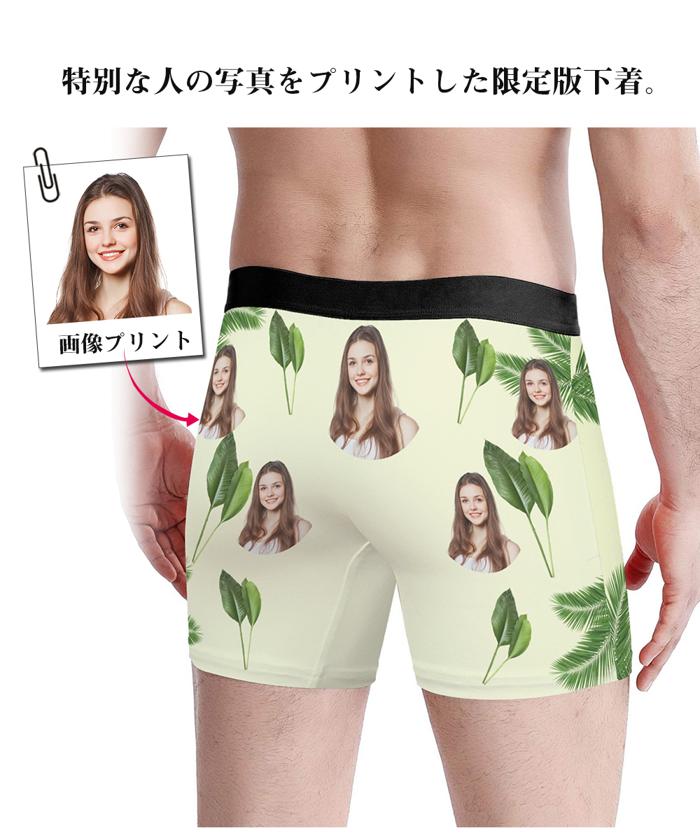 【写真入りボクサーパンツ】メンズ オーダーメイド下着 カスタムプリント 緑葉デザイン 5色展開 名入れ プレゼント ギフト 誕生日 サプライズ S〜3XL対応