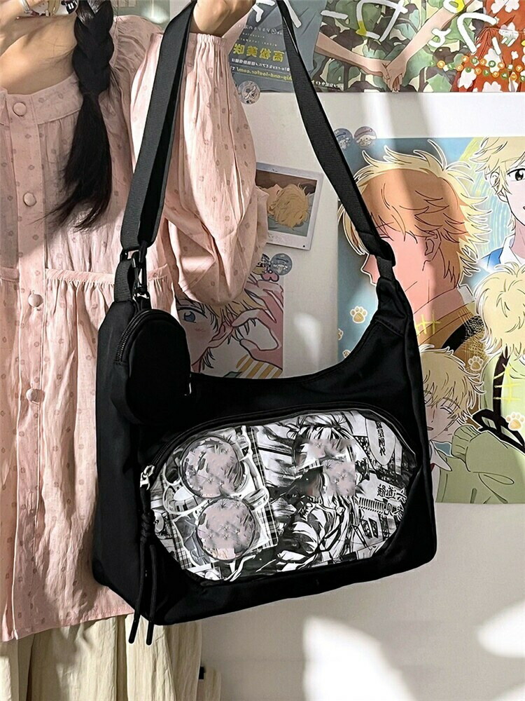 透明窓付きで「推し」がしっかり見せられる、ショルダータイプの痛バッグです。ぬいぐるみ・缶バッチ・キーホルダー・アクスタなど、お気に入りを自由にデコレーションできるデコバッグで、イベントやオタ活にもぴったり。