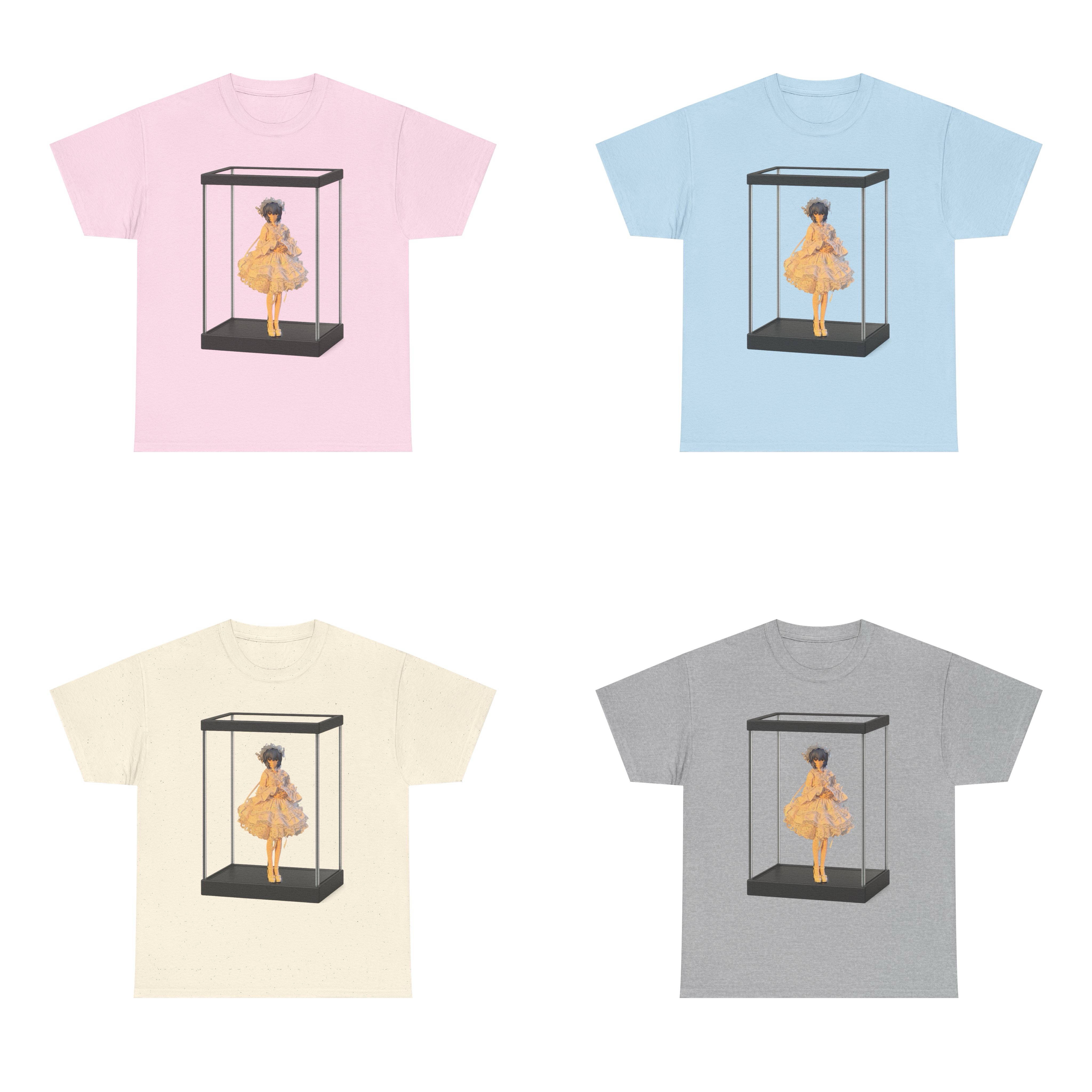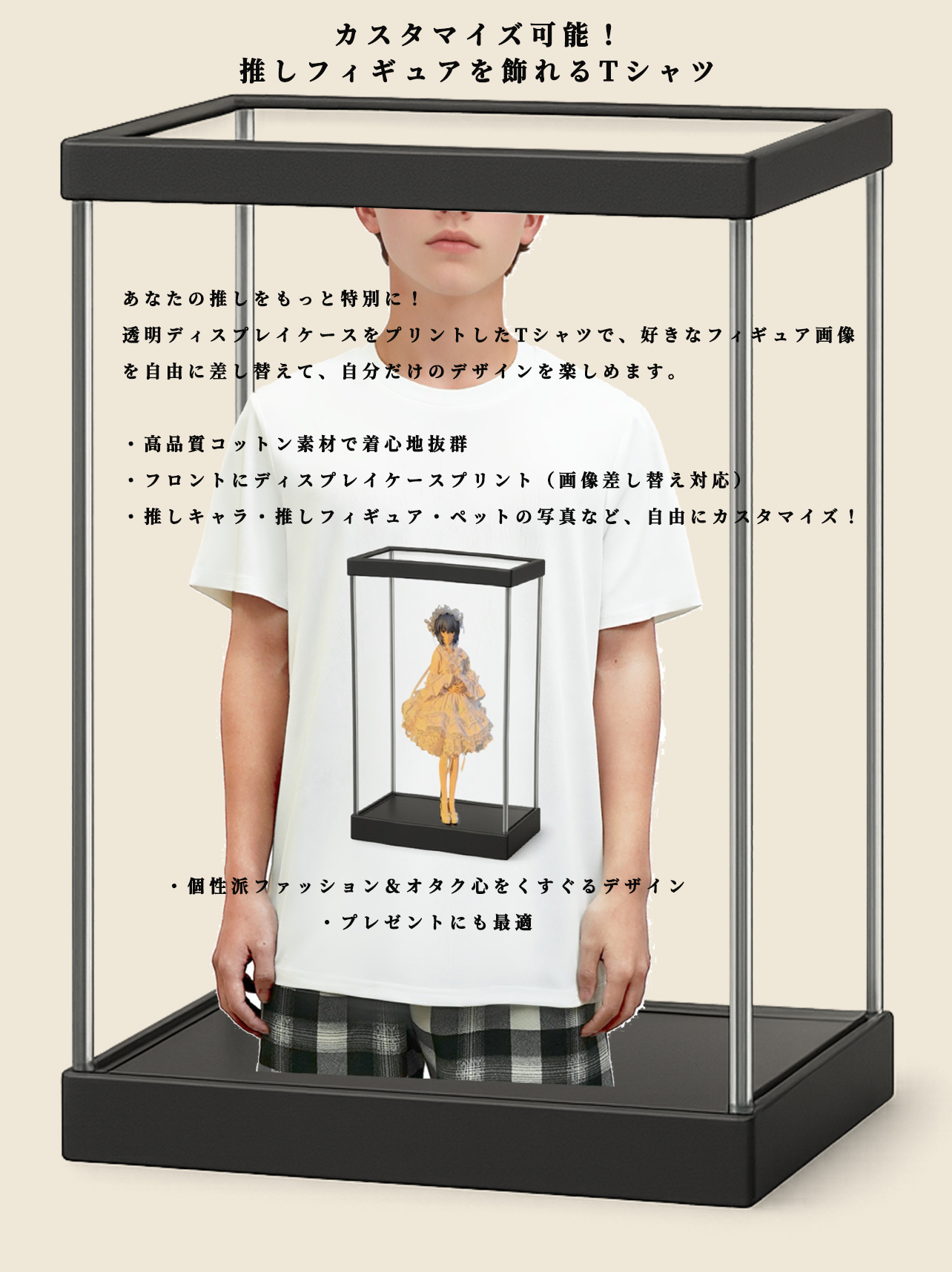 透明ディスプレイケースをプリントしたTシャツで、好きなフィギュア画像を自由に差し替えて、自分だけのデザインを楽しめます。