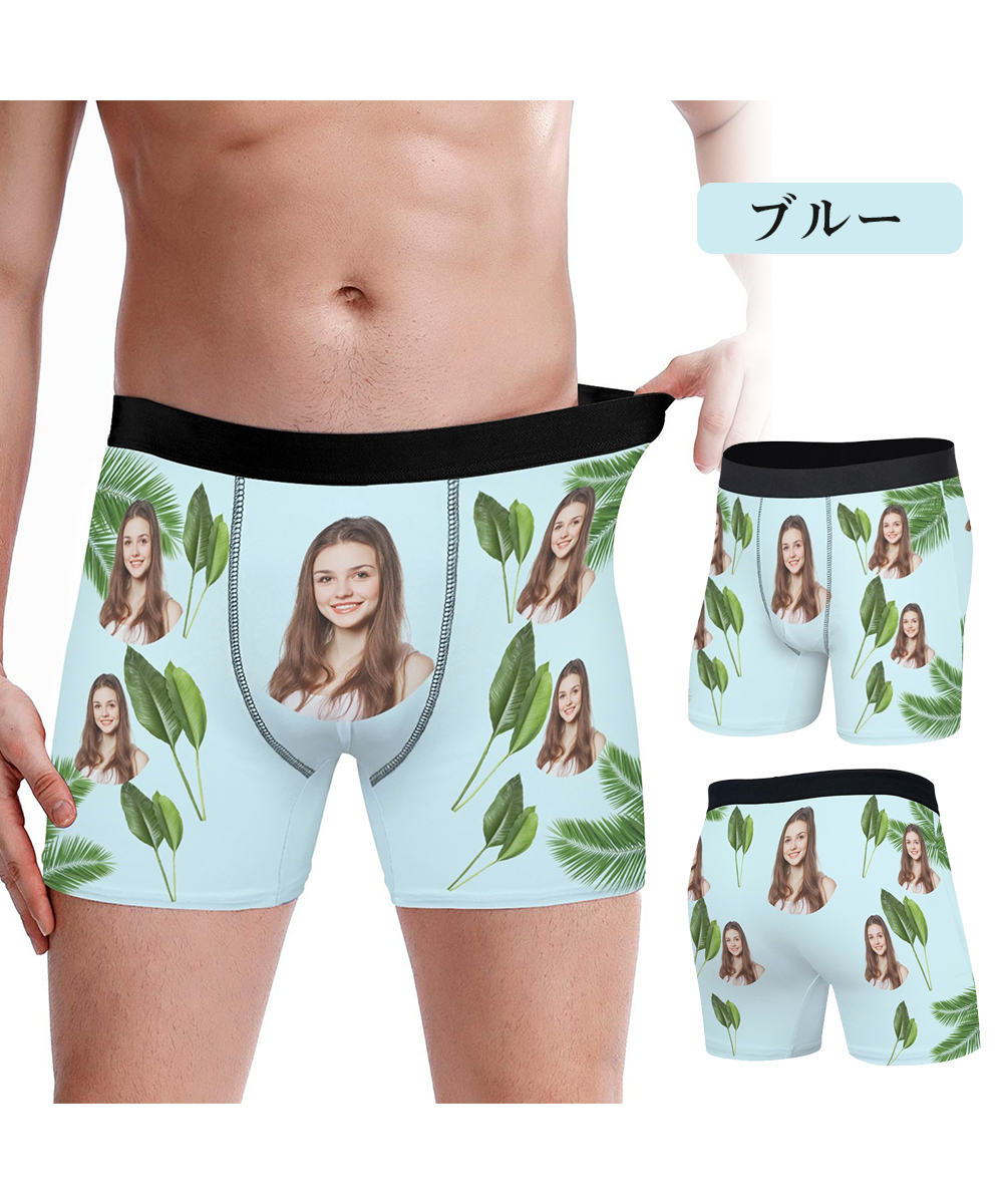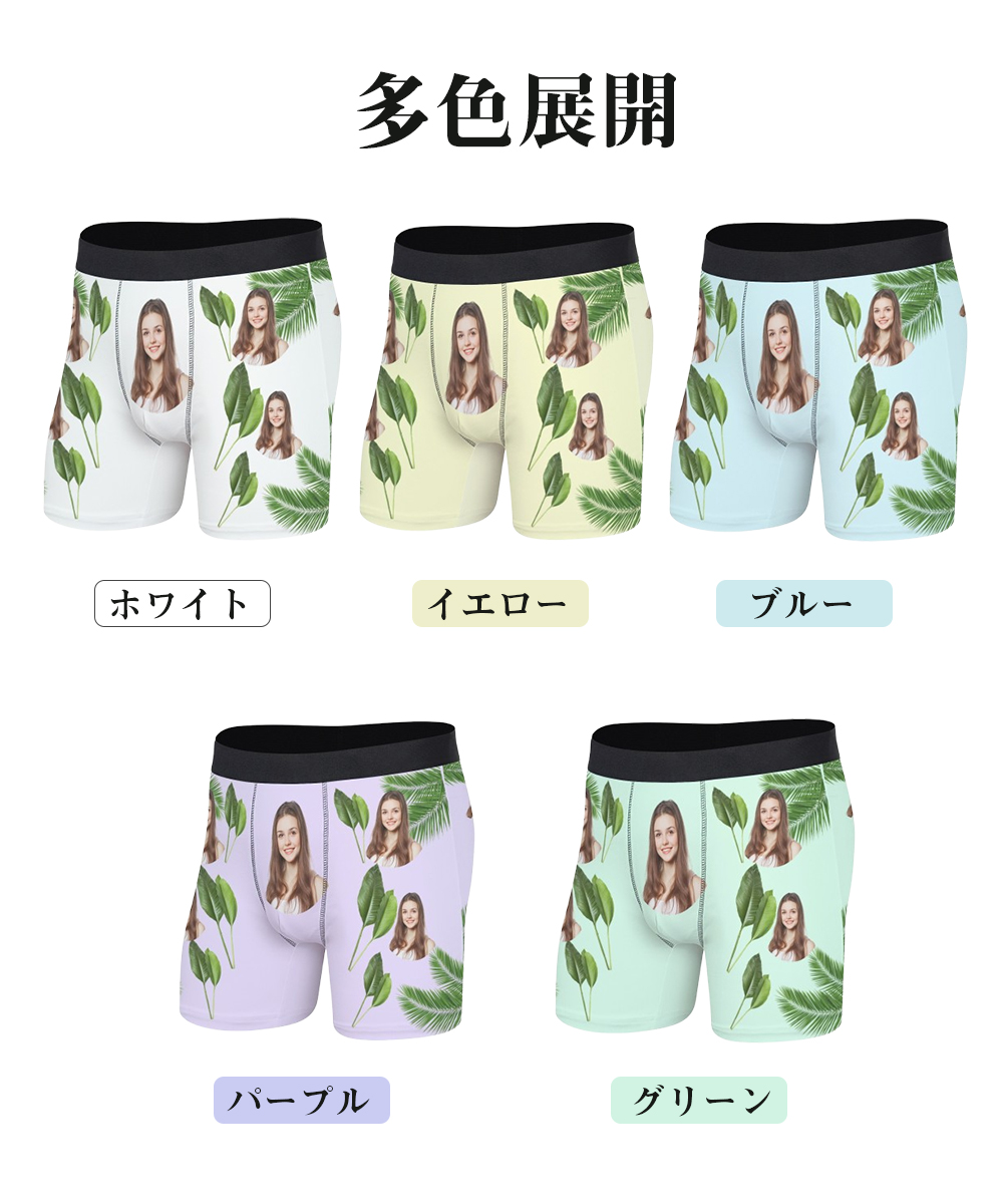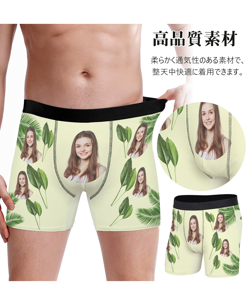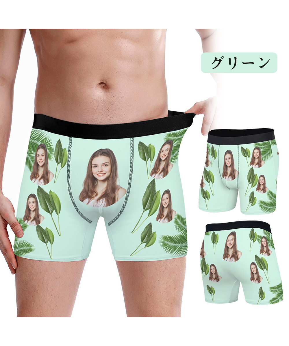 【写真入りボクサーパンツ】メンズ オーダーメイド下着 カスタムプリント 緑葉デザイン 5色展開 名入れ プレゼント ギフト 誕生日 サプライズ S〜3XL対応